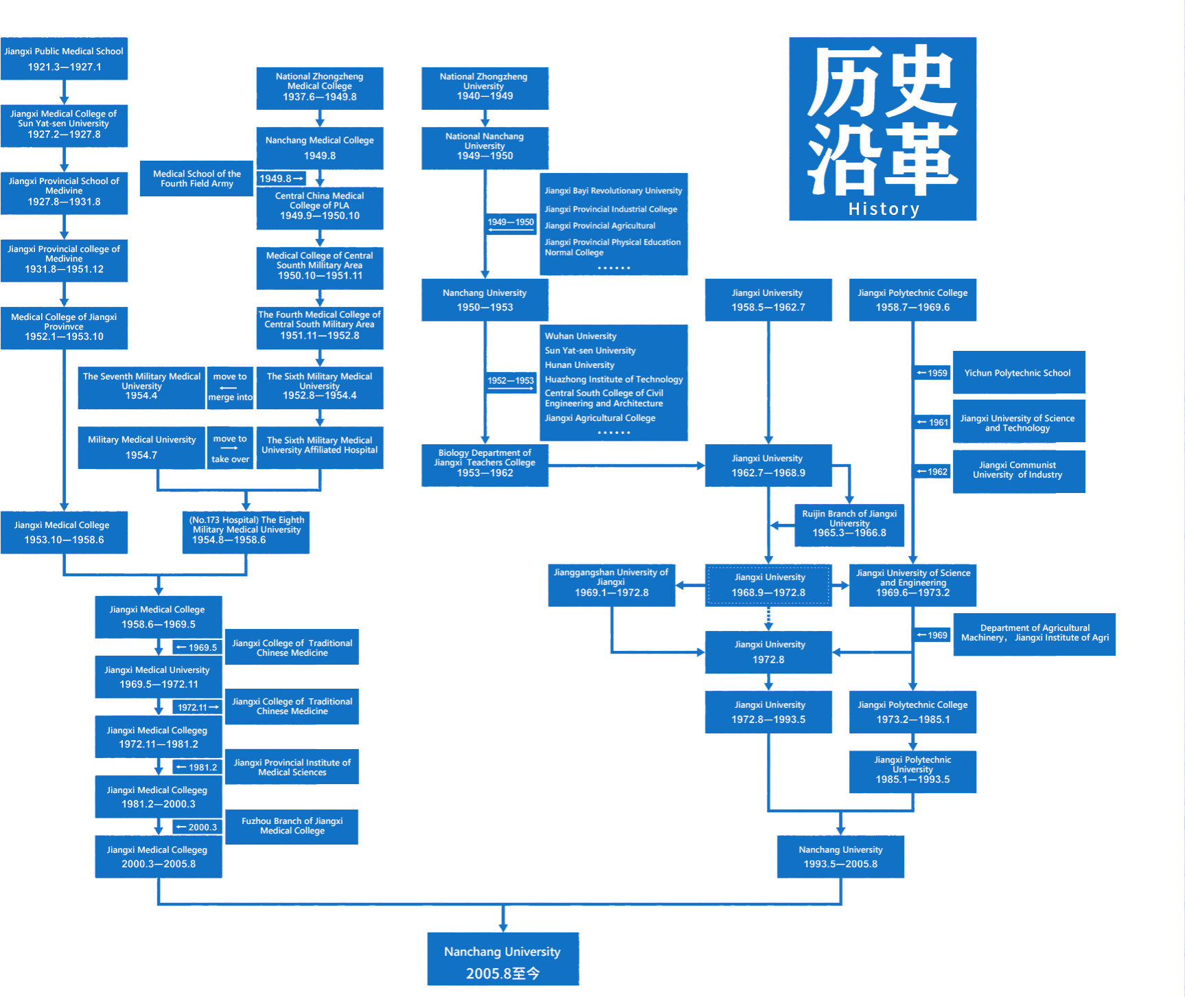 The history of NCU dates back to Jiangxi Medical College, Jiangxi University and Jiangxi Industrial University, which were originated from Jiangxi Public Medical College and National Chung-cheng University founded in 1921 and 1940 respectively.