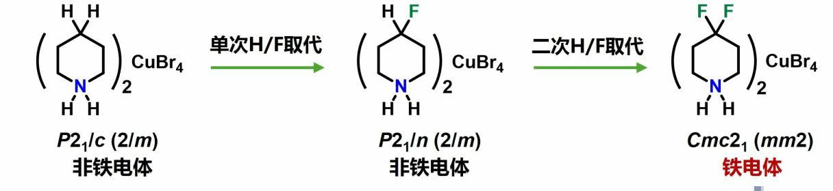 The primary TOFU effect (H/F substitution strategy) is one of the important design principles in ferroelectrochemistry. Similar to the H/D isotope effect, it exhibits wider applicability. Since the Pauling radius of the F atom is close to that of the H atom, replacing H atoms with F atoms generally does not significantly alter the crystal packing, so the crystal point group can often remain unchanged, analogous to the H/D isotope substitution effect. As shown in Figure 1, after primary H/F substitution of the H atom at the 4-position of the piperidinium organic cation in the non-ferroelectric parent compound (piperidinium)2CuBr4, the crystal point group (2/m) of the resulting compound (4-fluoropiperidinium)2CuBr4 remains unchanged, similar to the H/D isotope effect.