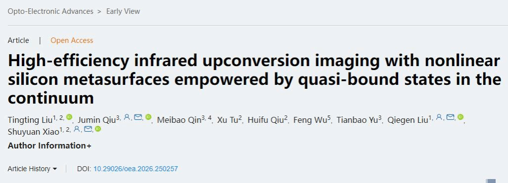 The Imaging and Visual Representation Team at the School of Information Engineering, Nanchang University (NCU), has made important research progress in the field of nonlinear optical imaging. The team proposed a silicon-based nonlinear metasurface design based on Quasi-Bound States in the Continuum (Quasi-BICs), realizing high-efficiency infrared upconversion imaging. The relevant results, entitled “High-efficiency infrared upconversion imaging with nonlinear silicon metasurfaces empowered by quasi-bound states in the continuum”, have been published online in Opto-Electronic Advances (Impact Factor: 22.4), a top domestic journal in the optical field.