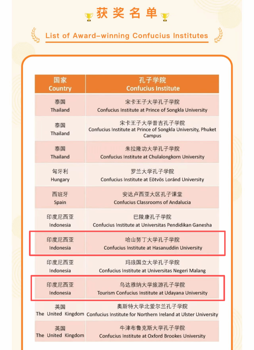 Recently, the Chinese International Education Foundation (CIEF) released the results of the 2025 Outstanding Communication Confucius Institutes selection. Out of more than 500 Confucius Institutes (CIs) across the globe, 42 have been honored. Nanchang University (NCU) is proud to announce that two of its Confucius Institutes in Indonesia are on the award list: 1. Confucius Institute at Hasanuddin University, 2.Tourism Confucius Institute at Udayana University in Indonesia.